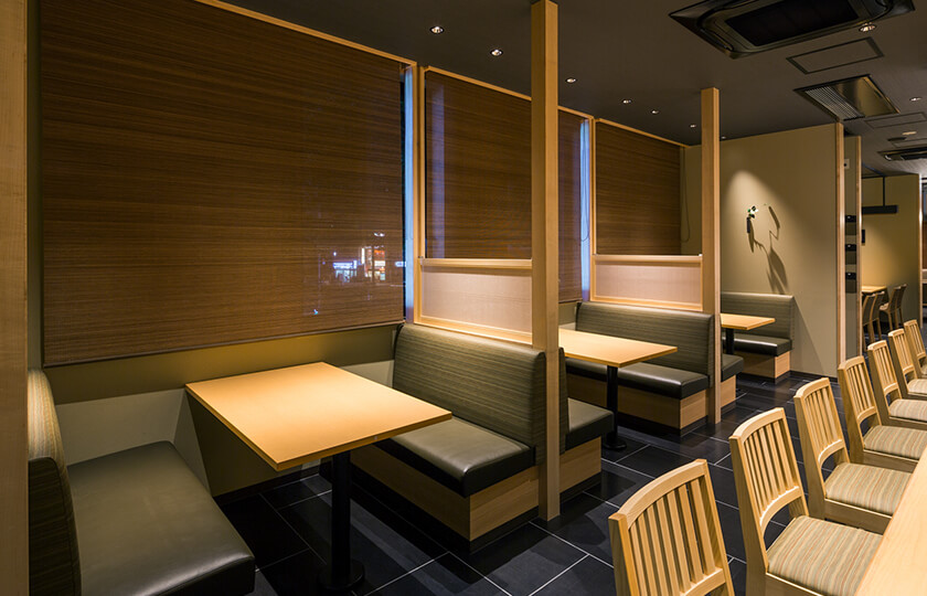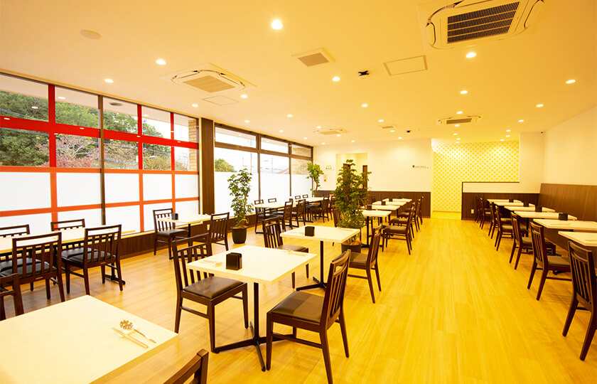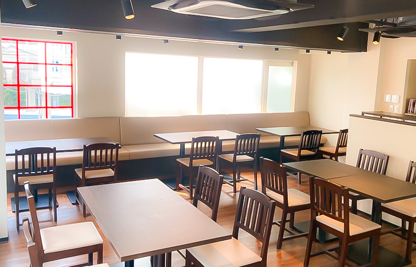 明るくベンチシートがあり、お子様メニューもある活気ある店。